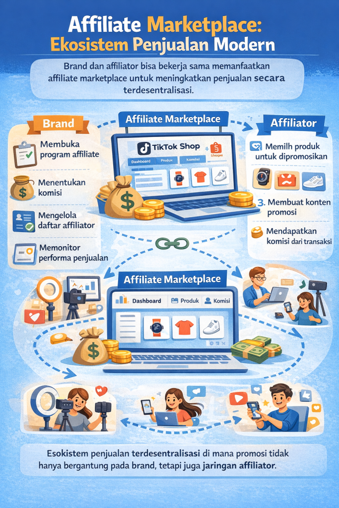 Marketplace modern seperti Shopee dan TikTok Shop telah menyediakan sistem affiliate bawaan yang memudahkan brand dan affiliator untuk bekerja sama.