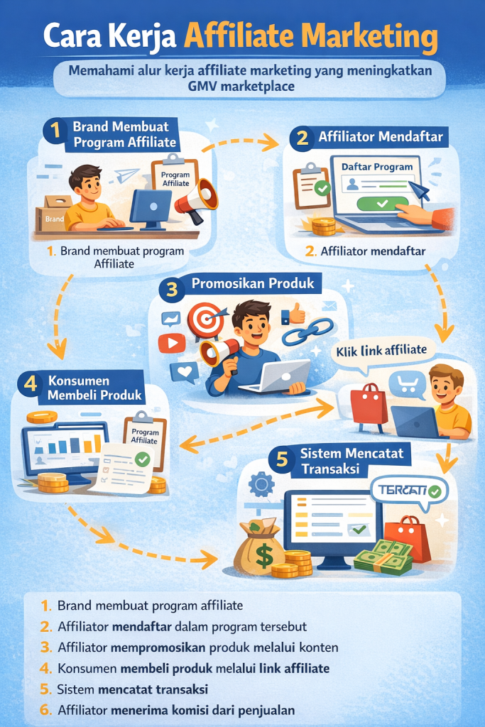Untuk memahami bagaimana affiliate marketing meningkatkan GMV marketplace, penting untuk mengetahui cara kerja sistem ini.