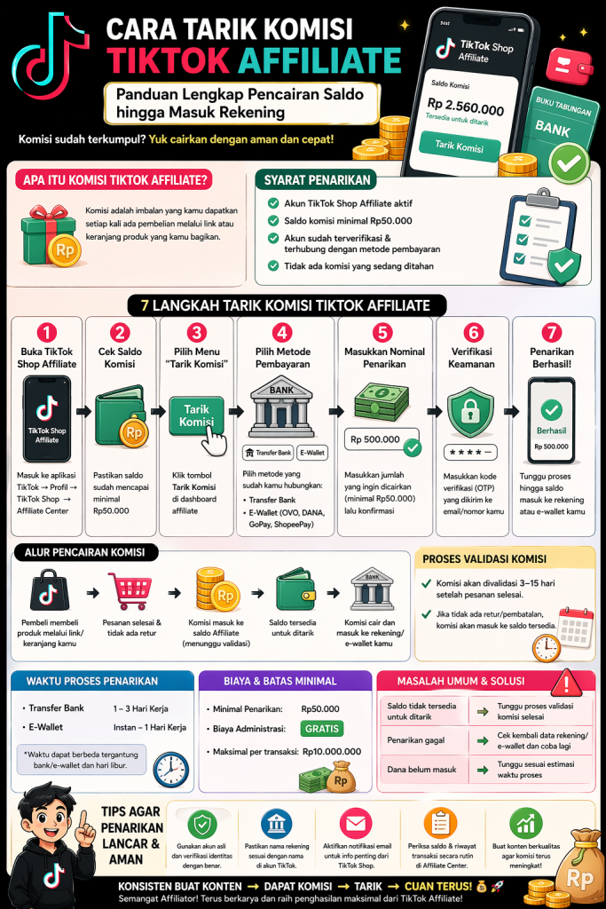 Cara tarik komisi TikTok Affiliate sebenarnya sederhana: hasilkan penjualan, tunggu saldo tersedia, lalu cairkan ke rekening.