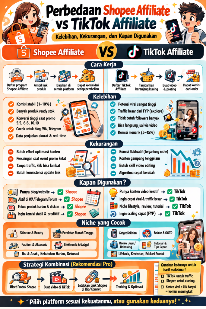 Artikel ini membahas secara mendalam perbedaan Shopee Affiliate dan TikTok Affiliate, termasuk kelebihan, kekurangan, serta kapan masing-masing lebih efektif digunakan.